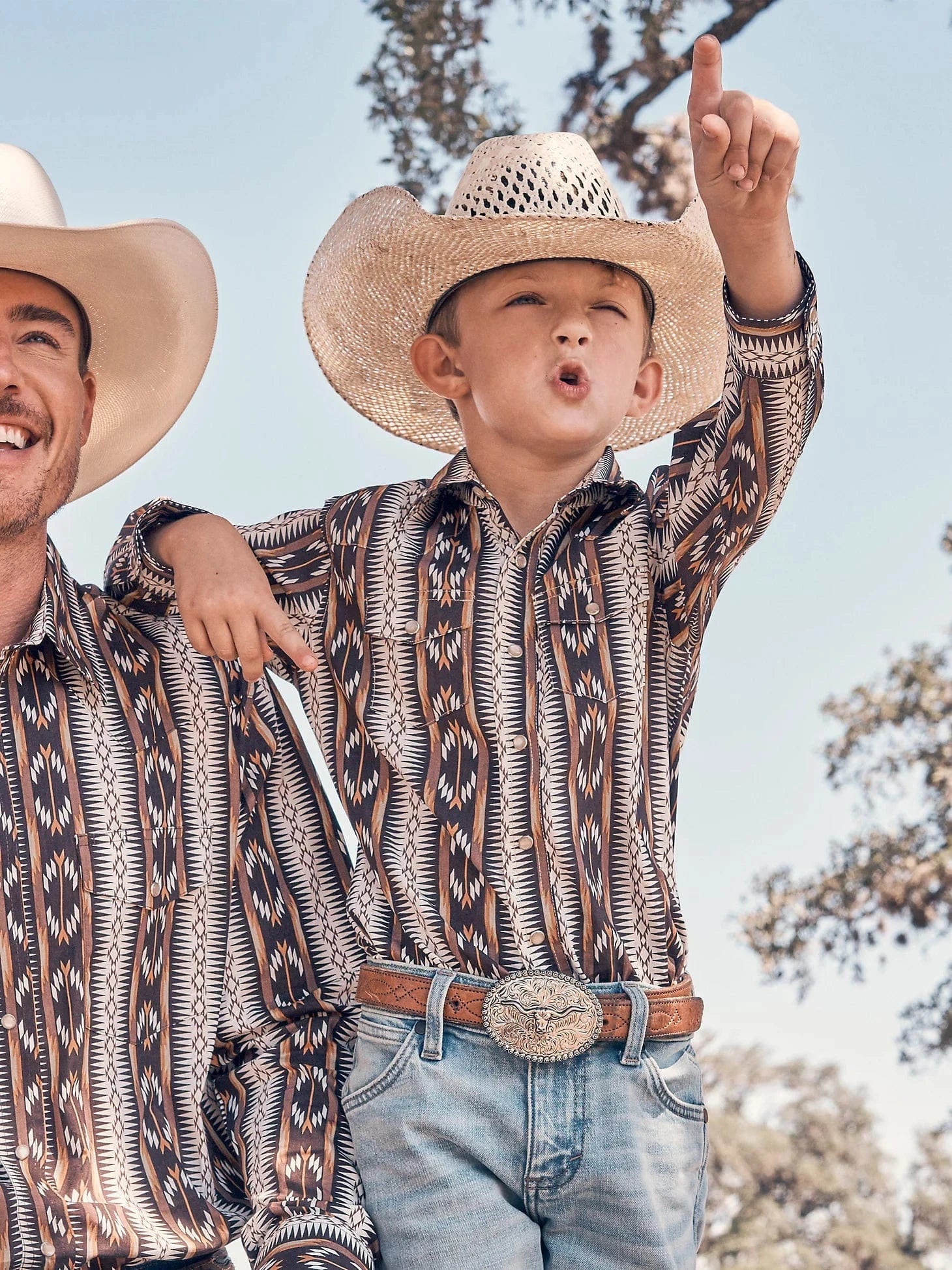 A desert-print motif keeps the frontier spirit alive on this tailored shirt for your little guy. For an authentic cowboy look, it features details such as Western-style yokes, snap closures and flap pockets.