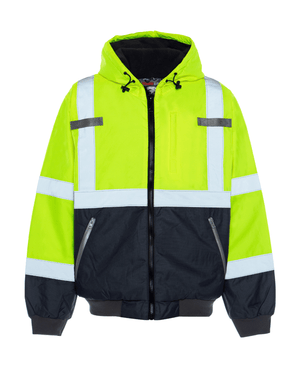 The Utility Pro™ UHV883 HiVis Warm Up Bomber with a microfleece-lined insulated hood is infused with Teflon™ fabric protector to repel liquid and stains. This bomber is made with a 100% polyester outer shell and a heat-reflective lining. ANSI Certified Type R Class 3.