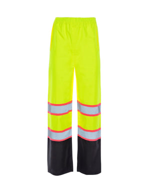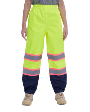 The Utility Pro™ UHV973 Women's Hi-Vis Rain Pants are infused with Teflon™ fabric protector. These high visibility pants feature a waterproof fabric with taped seams and pink accented reflective tape.