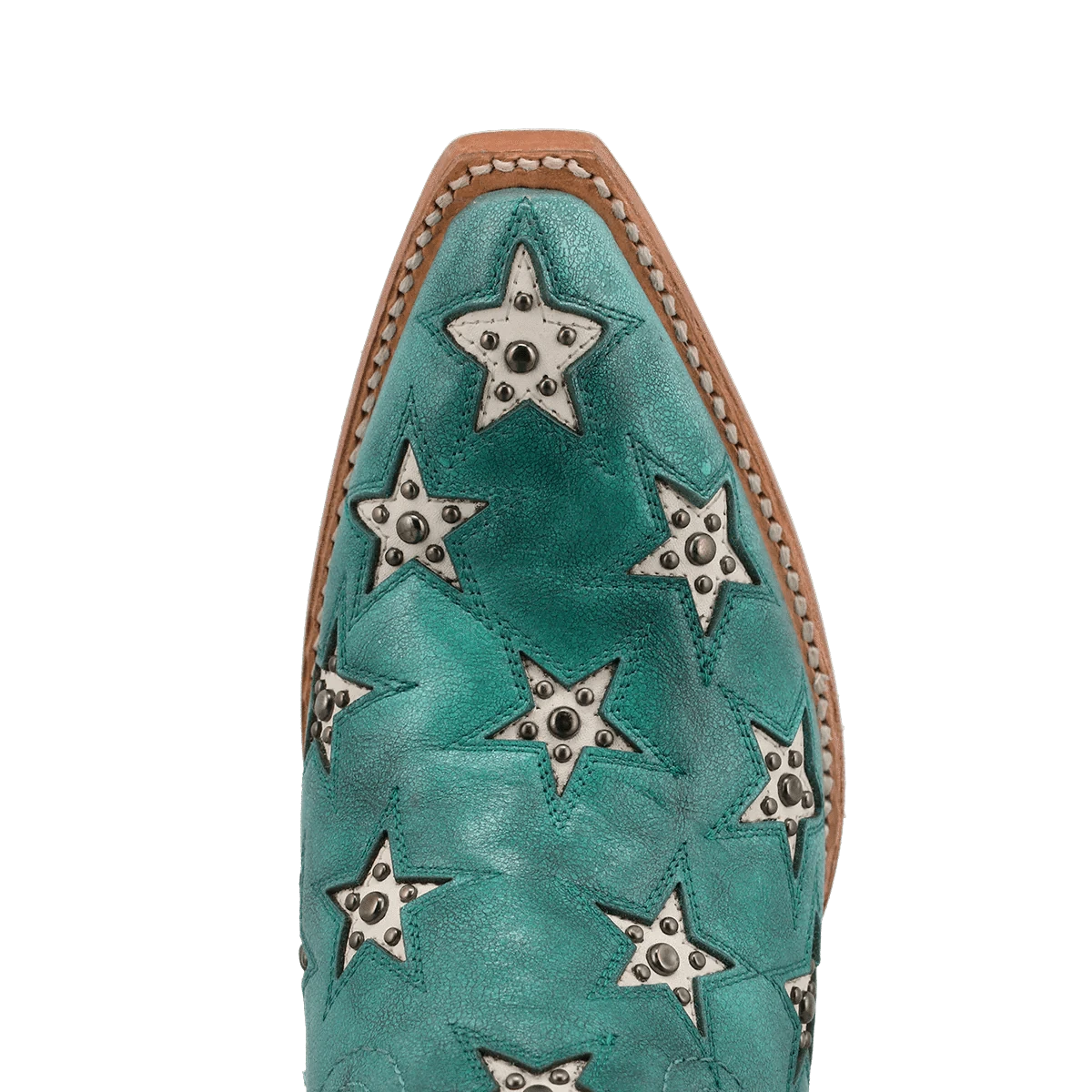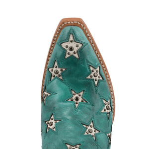 Find comfort in the stars with this Marfa boot. Dressed in beautiful turquoise full-grain leather and adorned with champagne inlay stars and studded embellishments, you are sure to turn heads in this showstopper boot. The Marfa features a 12" shaft height, 2" western heel, and snip toe for a sleek profile design. The Marfa is just as comfortable as it is beautiful thanks to a cushioned footbed and soft leather lining.
