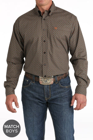 Our brown geometric printed cotton plain weave is your new everyday essential. A versatile addition to any wardrobe, this handsome shirt features a classic fit, an open left front pocket with an embroidered CINCH logo, and brown buttons.