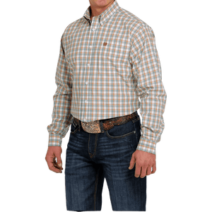 Cinch Men's White/Teal/Brown Plaid Classic Fit Long Sleeve Button Down Shirt MTW1105467