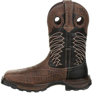 This is the men's 11" Western Waterproof Steel Toe Chocolate Safari Elephant/ Black Durango® Maverick XP™. This style is full-grain leather with a faux exotic elephant embossed vamp, collar and pull straps with a faux shaft. Inside it has a soft mesh lining and a Durango® Waterproof membrane bootie to keep your feel dry all day long. It has the Durango® X-Pand System™ which is a hidden gore expansion on the inside medial seam for a universal fit and easy on/off.