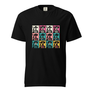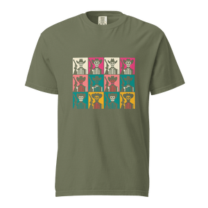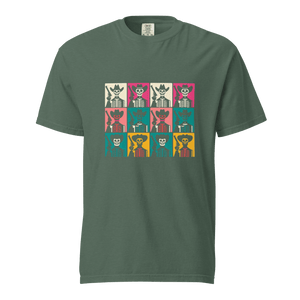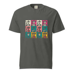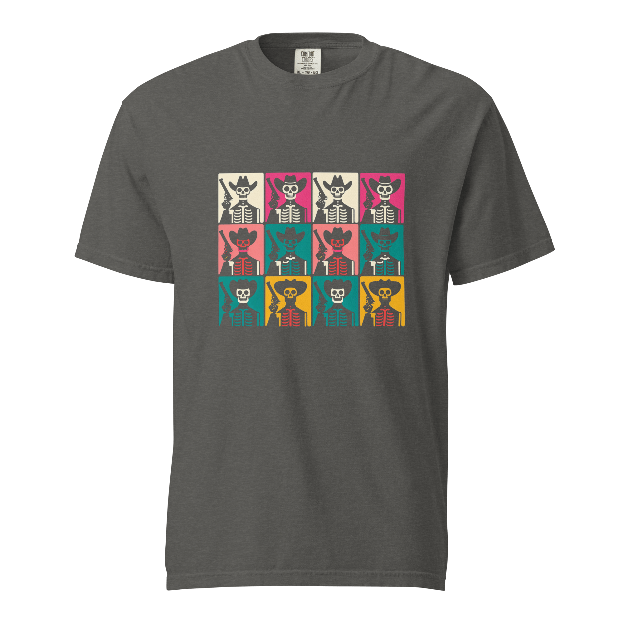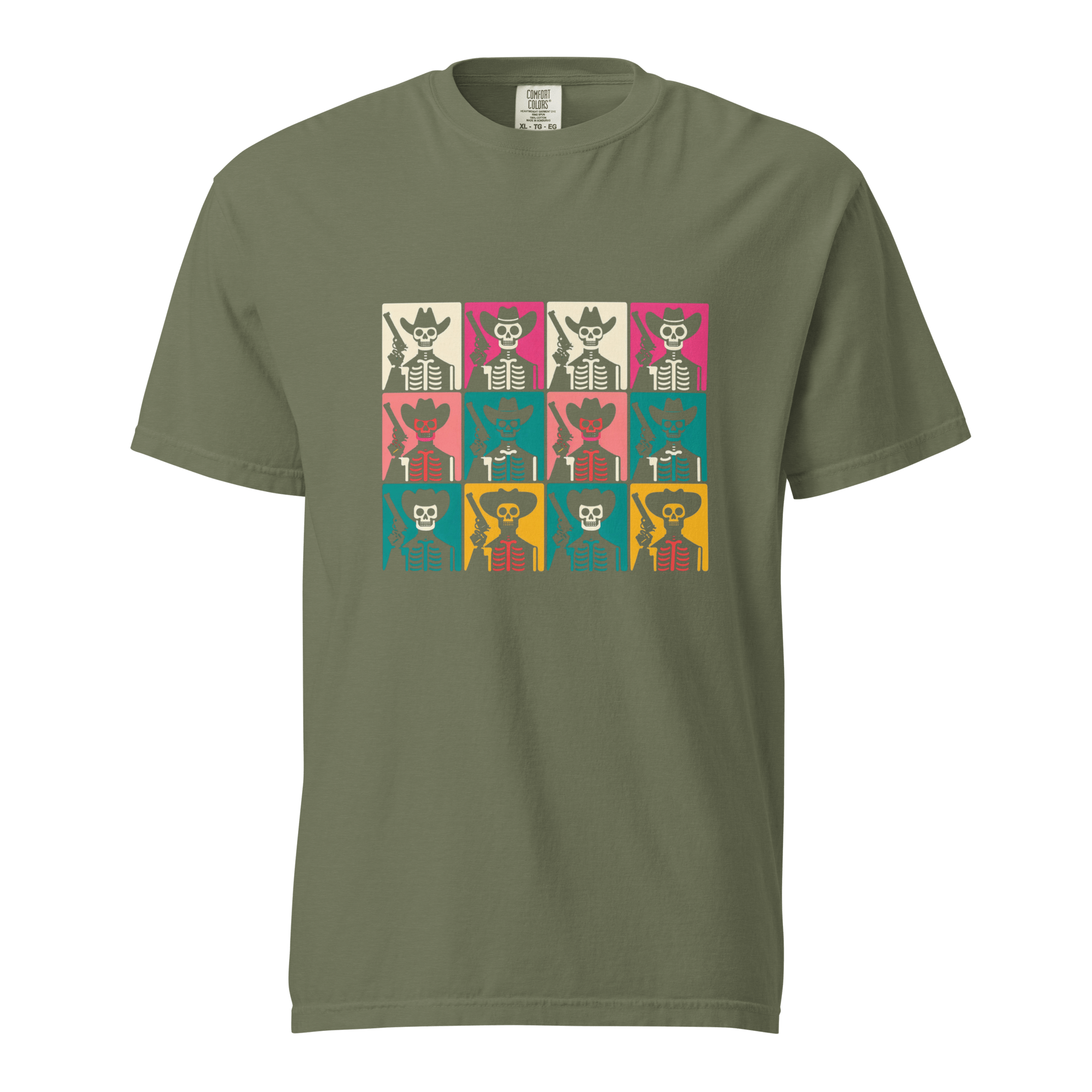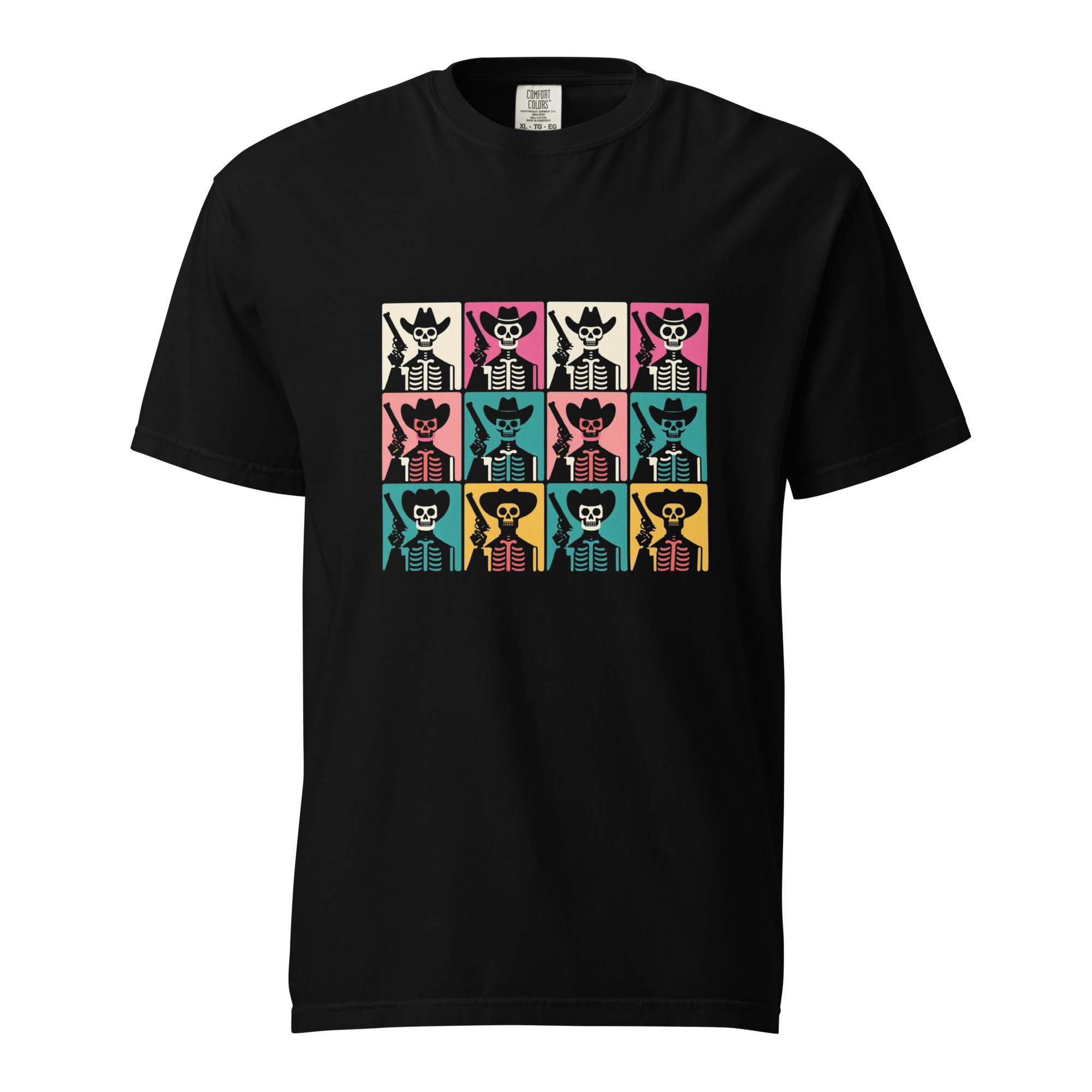 Behold, gentlefolk and ruffians alike, the 'Family Portrait' tee, a garment where the hues of yesteryear dance macabrely with the skeletal remains of desperado kin, their bony visages and cowboy regalia merging in a tableau most whimsical and morbid.
