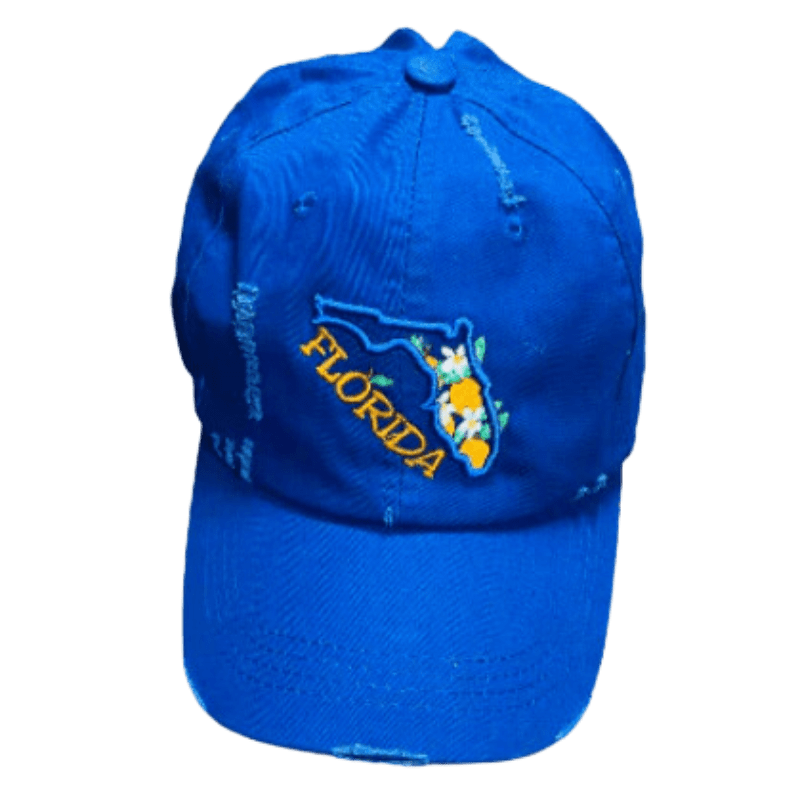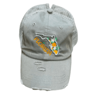 From Florida County Line, this Florida Orange Blossom Ponytail Hat will stun onlookers with the detail of the great orange crop of Florida. Available in grey or royal.