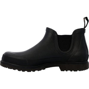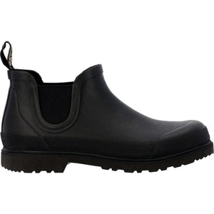 Take the classic Romeo silhouette and make it into a rubber boot. This waterproof rubber Romeo is built with a vulcanized rubber construction and durable overlays. It has elastic gore stretch panels for easy on and off. The interior features a removable polyurethane foam insole for comfort with every step and a high-performance lining. This black rubber boot has a double-ribbed steel shank for durability and an oil-resistant polyurethane outsole.