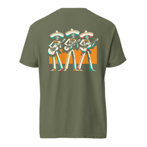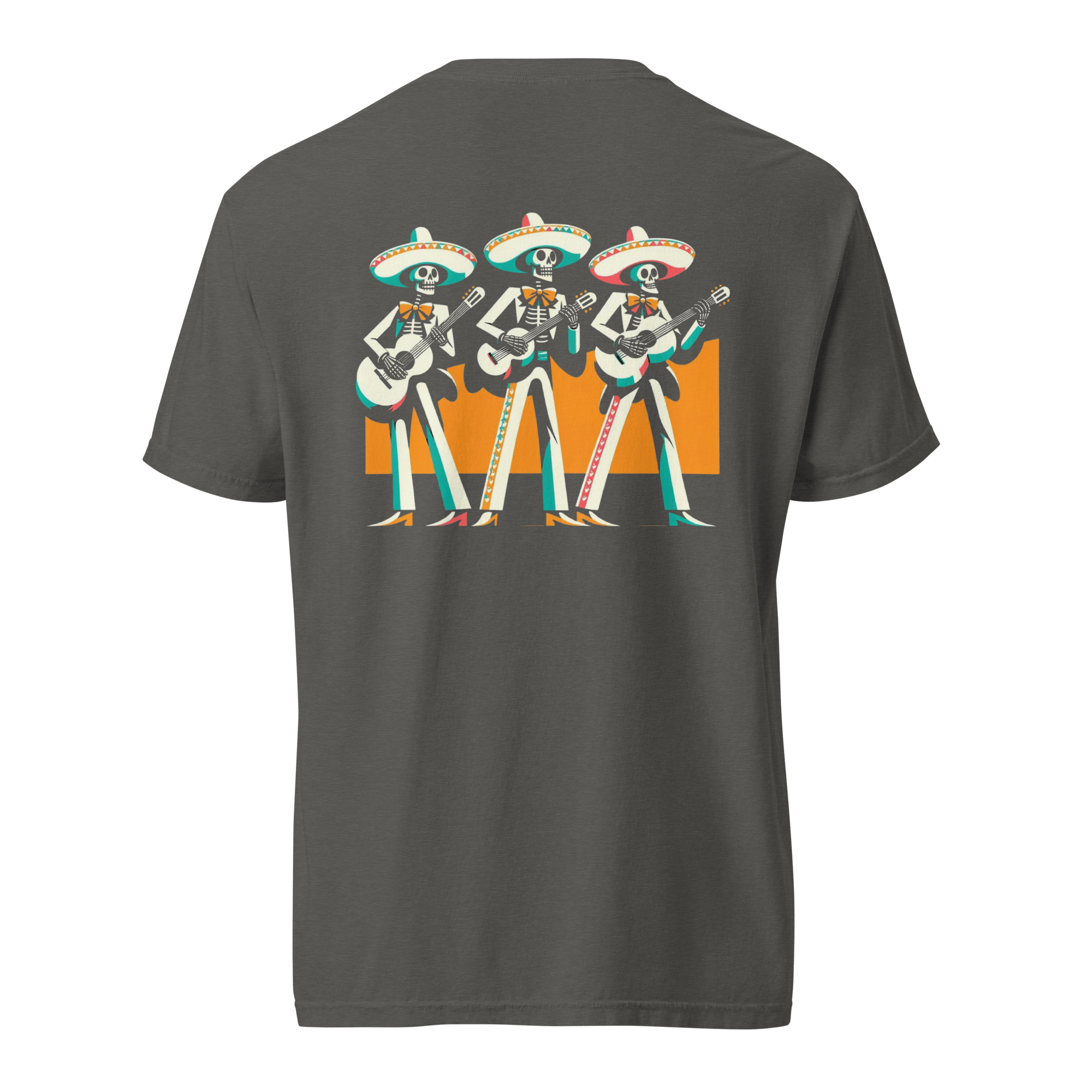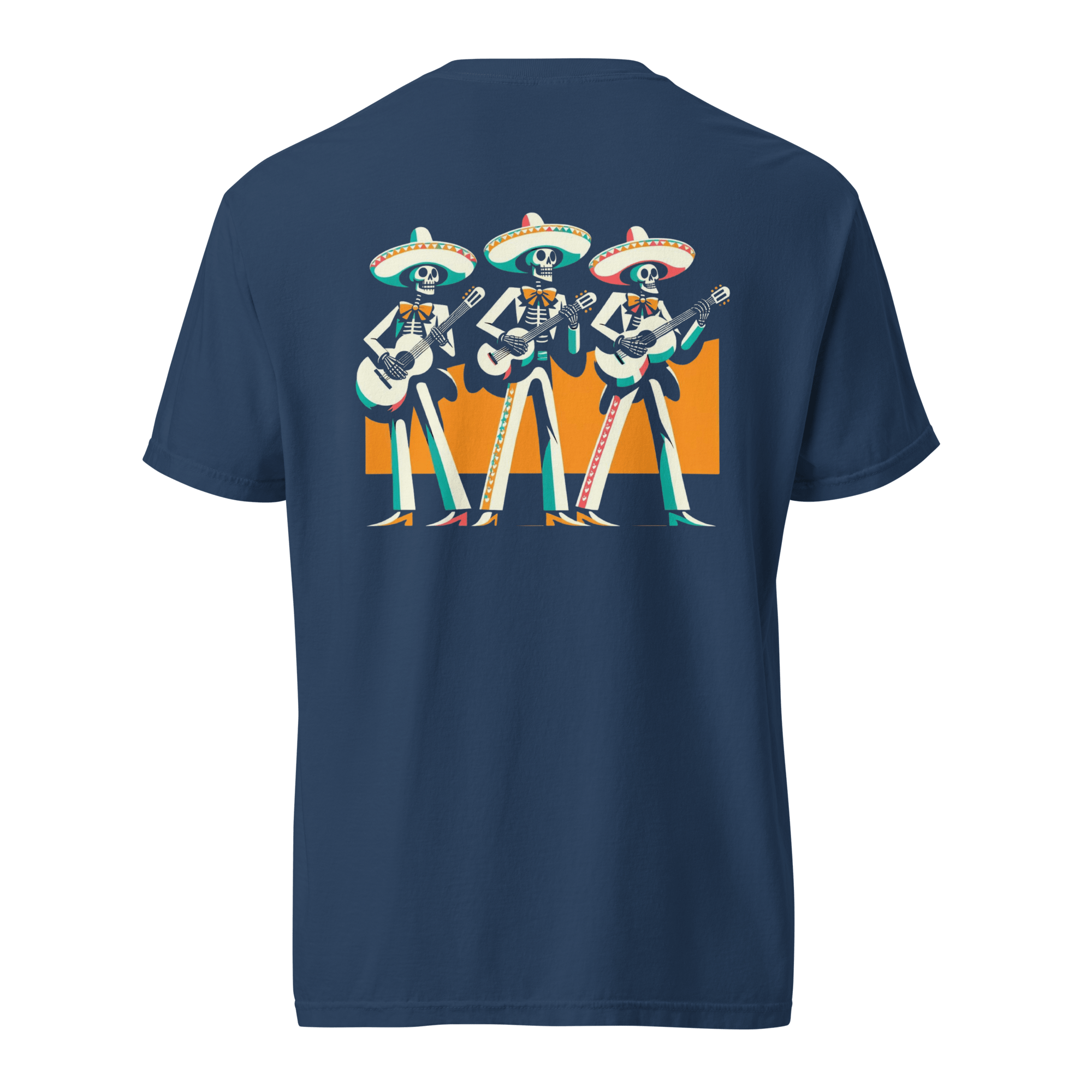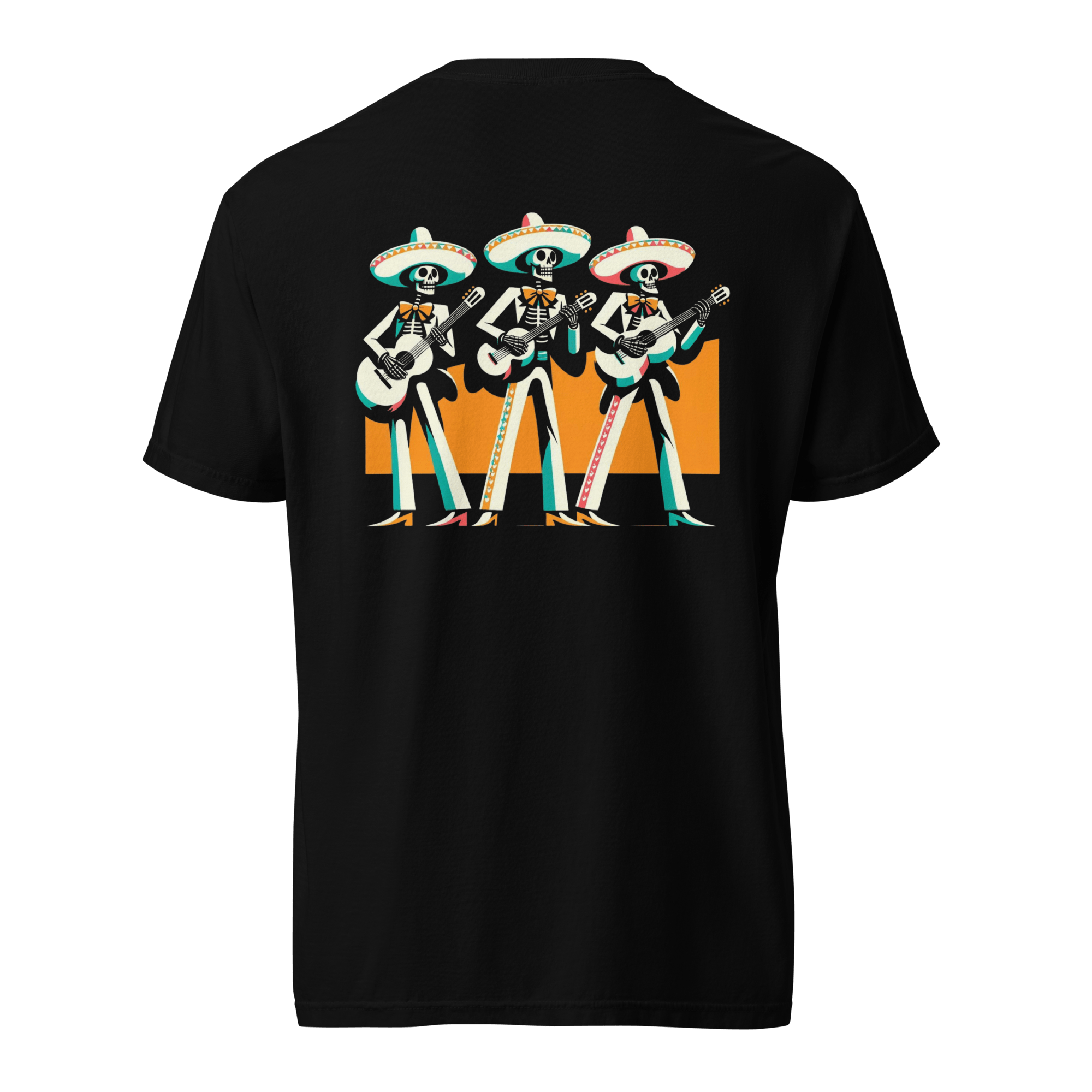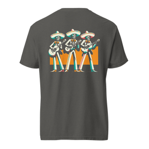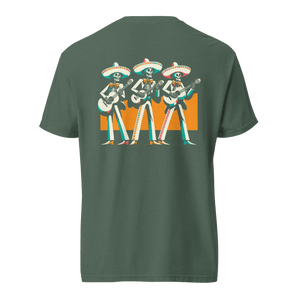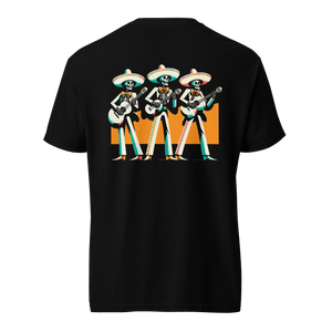 Introducing our Skeleton Mariachi Graphic Tee: a harmonious blend of vibrant culture and playful design. This unique shirt captures the spirited essence of mariachi music through a whimsical skeleton ensemble, dressed in traditional attire and poised to play.