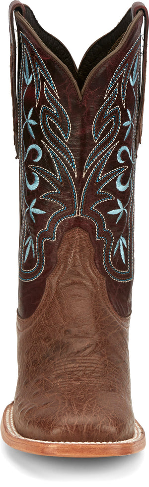 The 11” Tinrose in tabac is a bold, traditional boot crafted with Tony Lama’s fine quality from start to finish. The redblood cowhide upper with lovely scrolled sky blue stitching sits above the tabac smooth ostrich vamp for a striking effect. The wide square toe and the Removable Cushion Comfort® Insert leave plenty of room and comfort for your feet, while the leather outsole and ¾ double-stitch welt complete this finely crafted boot.